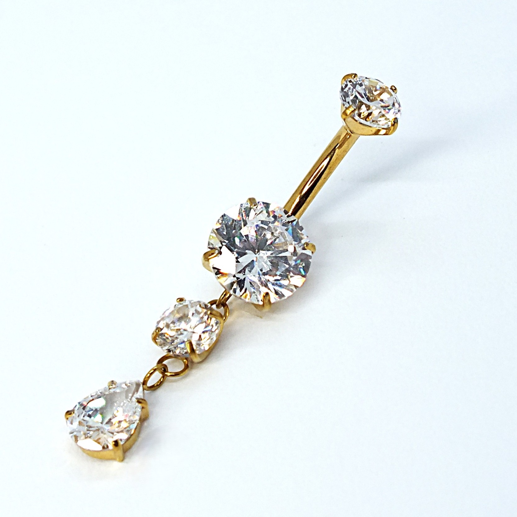 Implant-grade titaanist rippuva detailiga nabaehe kolme särava kiviga. Elegantne ja mugav igapäevaseks kandmiseks.